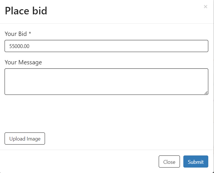 After clicking the ” Place bid” button on the ad page a popup will appear like this. Seller can send message and up to 3 images along with the bid price to the Ad owner (Buyer).